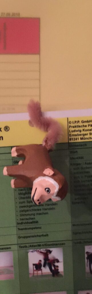 Ich arbeite mit L. in der 5. Stufe des Evopäd® Modells, der Affenstufe. Die immer wieder auftauchenden Streitereien in der Gruppe deuten drauf hin, dass sich die Schülerin schwer tut, wenn es um Teamkompetenzen geht. Dabei kann sie gut herrschen und Stimmung machen, es fällt ihr jedoch schwer sich anzupassen. Das umherwandern im Unterricht könnte darauf hindeuten, dass ihr der Überblick fehlt. Es könnte auch sein, dass L. sich von der Gruppe abhängig sieht und dabei ihre Individualität vergisst. Von Übungen im Turnunterricht, die Gleichgewicht, Klettern und Balancieren beinhalten, würde L. sehr profitieren. Dabei ist es wichtig, dass sie den Blick in der Balance frei im Raum umherschweifen lässt. Wahlweise könnte es auch Helfen einen Text auf dem Schaukelbrett o.ä. zu lesen, um das ziellose Umherwandern im Unterricht zu durchbrechen. Bei den Übungen bei mir in der Beratungspraxis begleite ich die Bewegungen sprachlich mit “Beschäftige dich mit dir selbst” oder “spiele mit den anderen”.